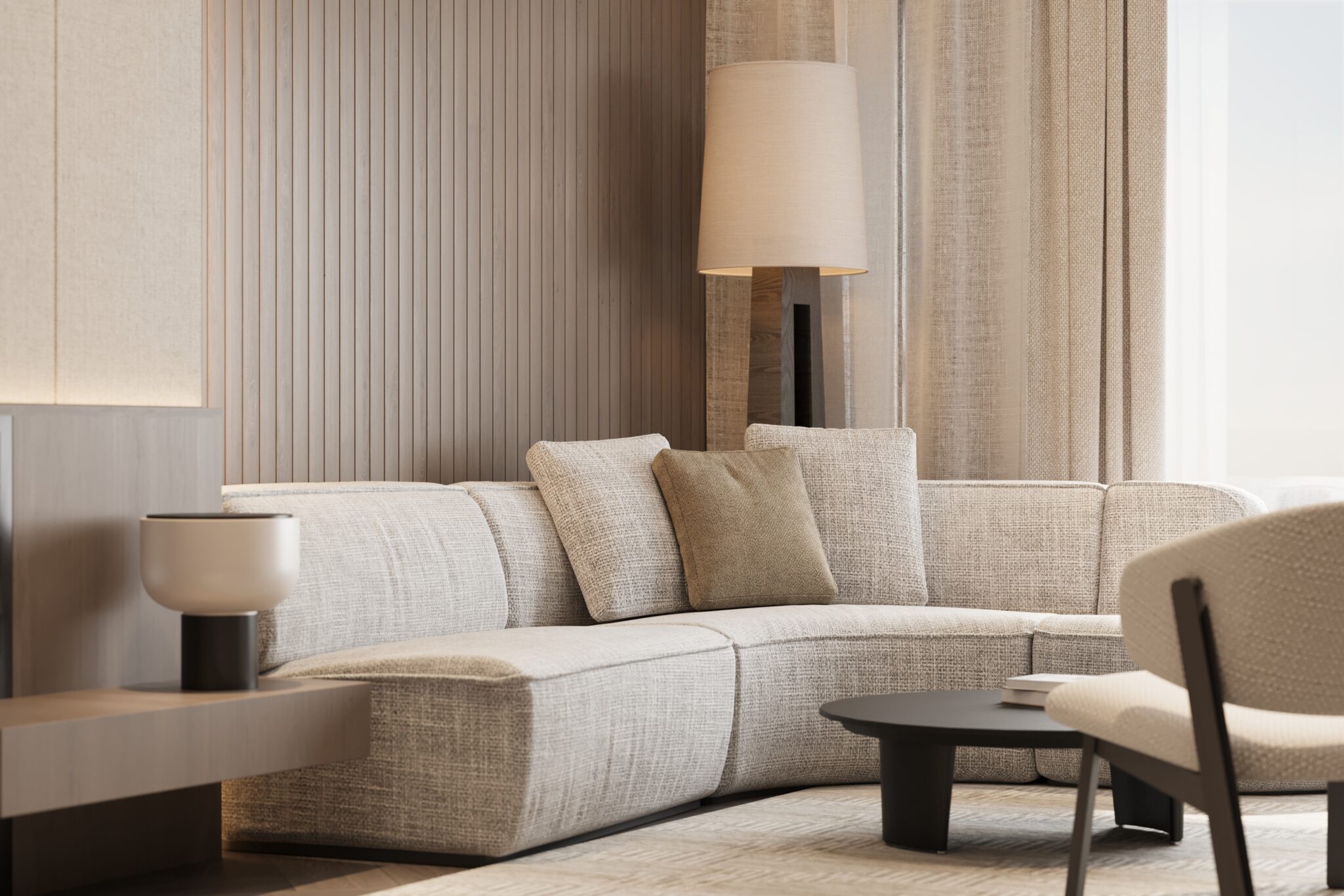 マテリアルの質感、光の反射、空間の色温度を精緻にコントロール。